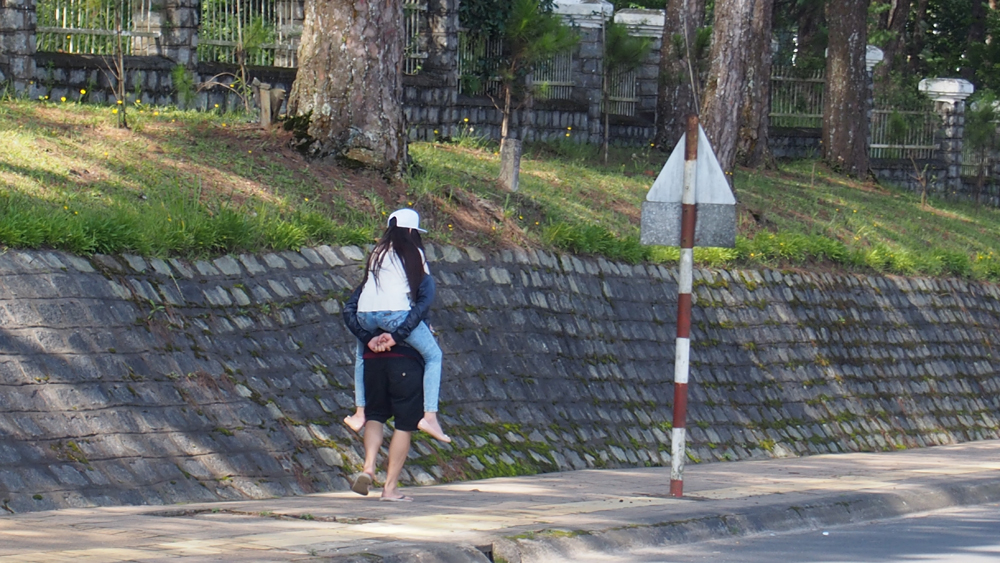Tình nhân cõng nhau đi dạo. Ảnh: Võ Anh Tuấn